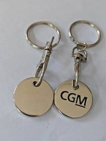 Der nützliche Einkaufswagenchip ist aus Metall gefertigt und hängt an einem Karabinerhaken und kann auch mithilfe des Schlüsselrings auch an einen Schlüsselbund angehängt werden. Er ist mit dem CGM-Logo blau graviert.