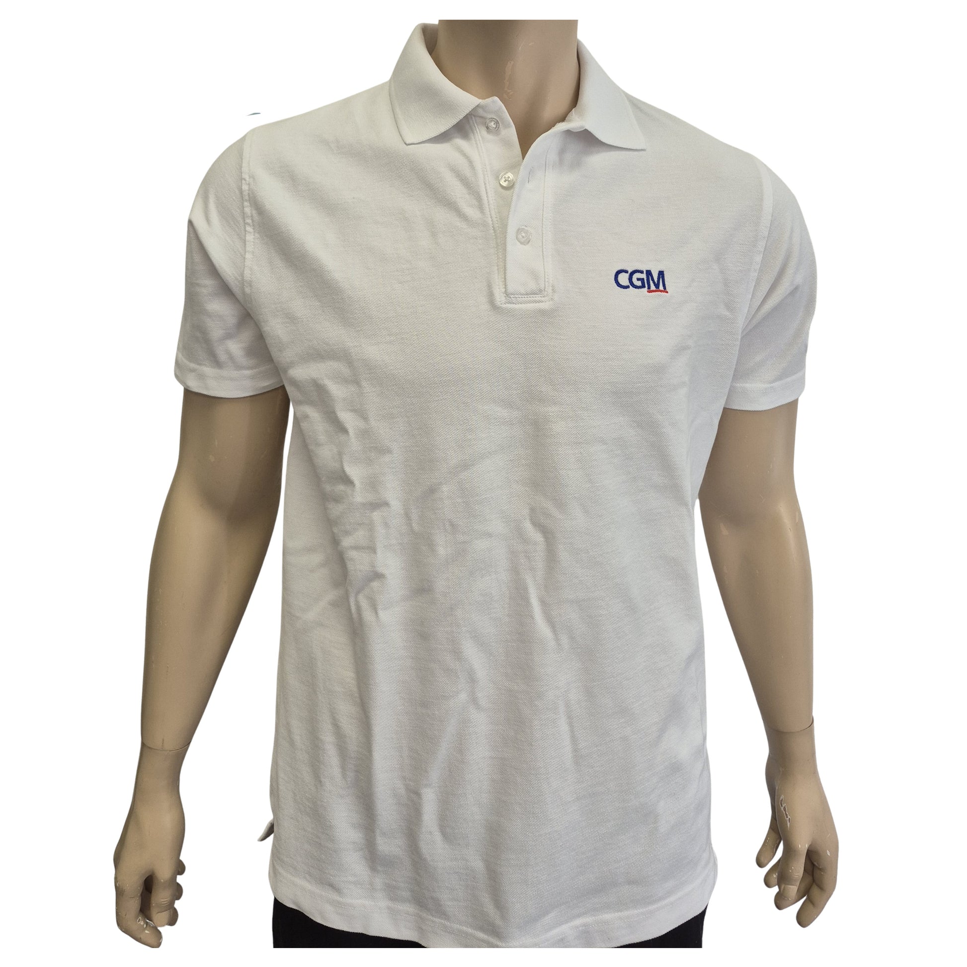 Das Poloshirt mit klassischem Schnitt in weiß ist ein Basisprodukt. Der Ausschnitt besitzt eine Dreiknopf-Leiste mit farblich angepassten Knöpfen. Die Ärmel sind mit Bündchen versehen. Auf der linken Seite des Poloshirts ist in Brusthöhe das CGM-Logo in dunkelblau eingestickt. Das Material besteht aus 100 % Baumwolle und ist bei 40° waschbar, bei niedriger Temperatur trocknergeeignet und bei niedriger Hitze bügelbar.